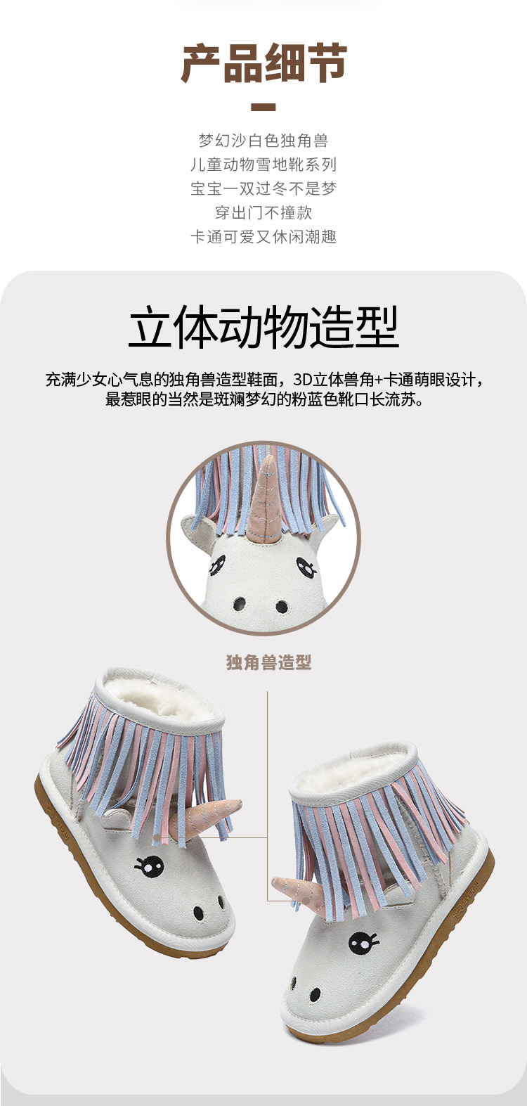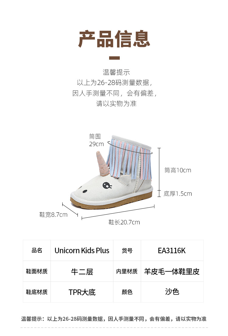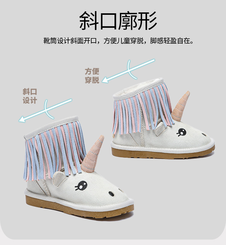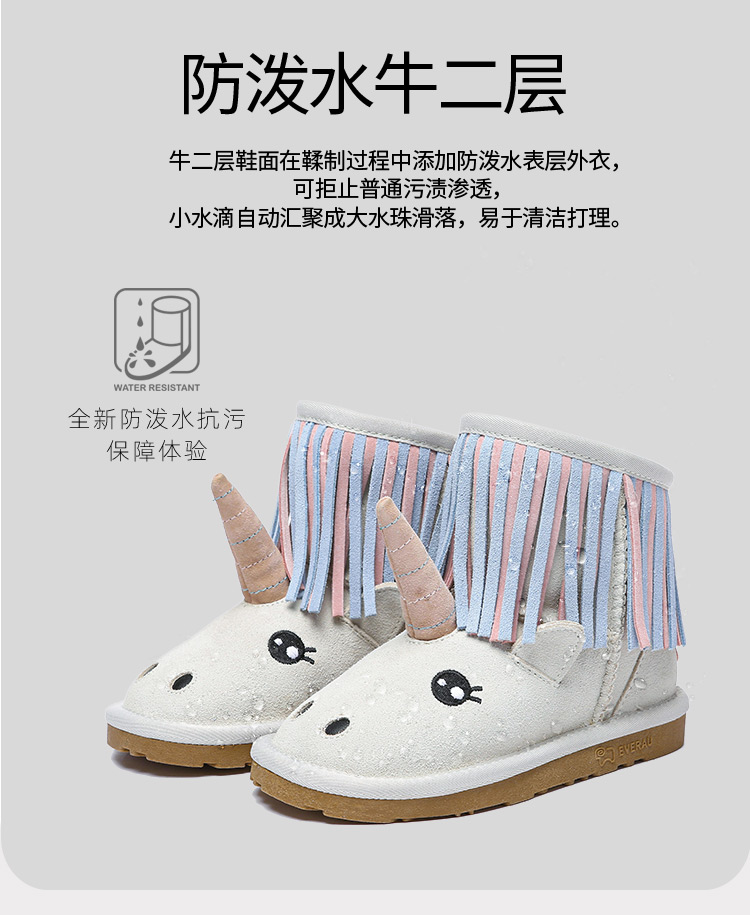 【中国仓】EVERAU kids 秋冬款独角兽款羊皮毛一体内里儿童雪地靴 EA3116K
