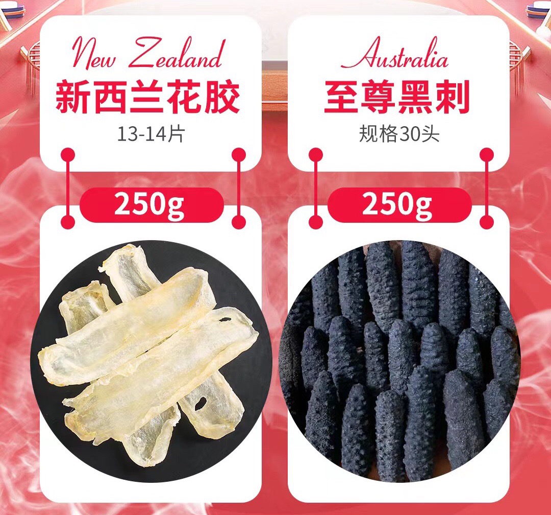【中国仓】【干货2_】海参套餐:新西兰白花胶250g/约13-14片/袋 + 澳洲至尊黑刺250g/约30头(袋装,礼盒+50元)
