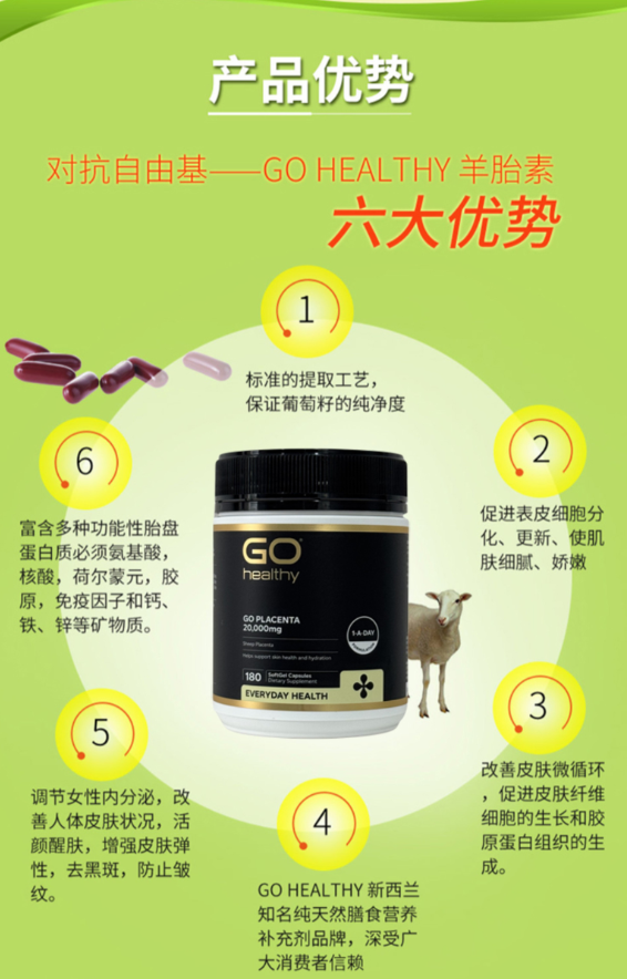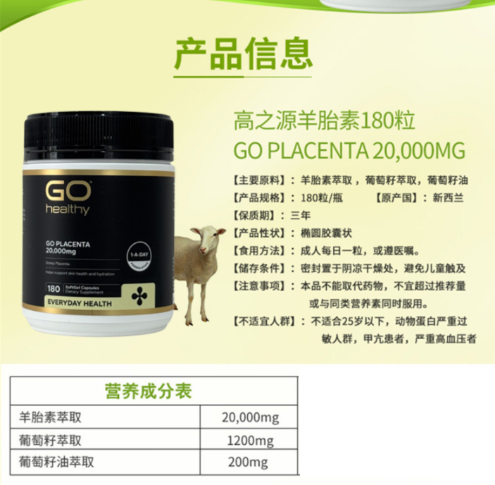 【产品名称】Go Healthy Placenta高之源羊胎素精华胶囊 20000mg 180粒