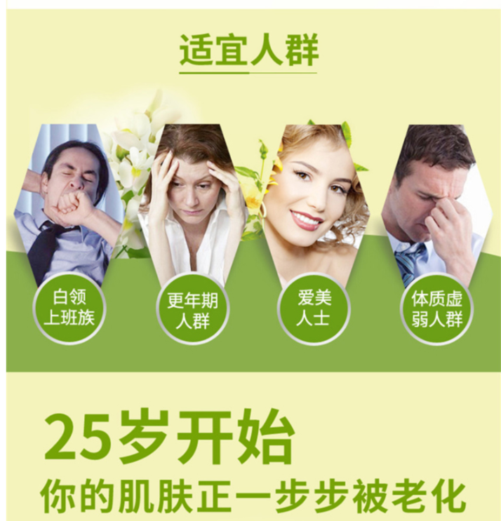 【适合人群】皮肤干燥,皱纹增多,面部色素沉着女性。欲延缓衰老者;更年期女性;欲提高免疫力,体质虚弱者。病后、手术后体质恢复者